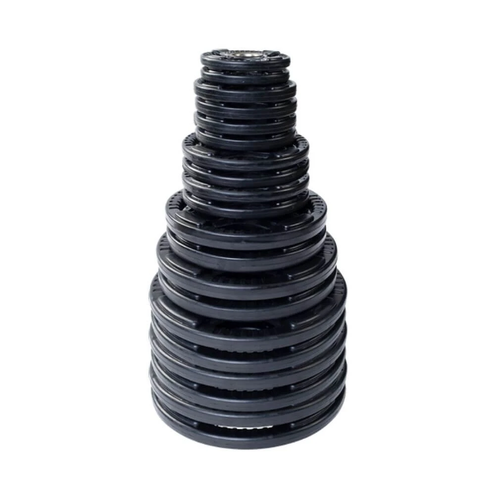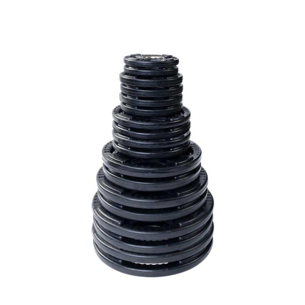 Body-Solid Rubber Grip Olympic Plates surpass competitor’s weight plates in quality, accuracy, reliability and price. Quad-grip design guarantees safer and easier performance. Body-Solid Rubber Grip Olympic Plates are encased in durable, heavy-duty rubber to prevent scuffing or damage to equipment, walls or floors. These plates feature an integrated metal sleeve providing a smooth, secure fit onto any Olympic bar.