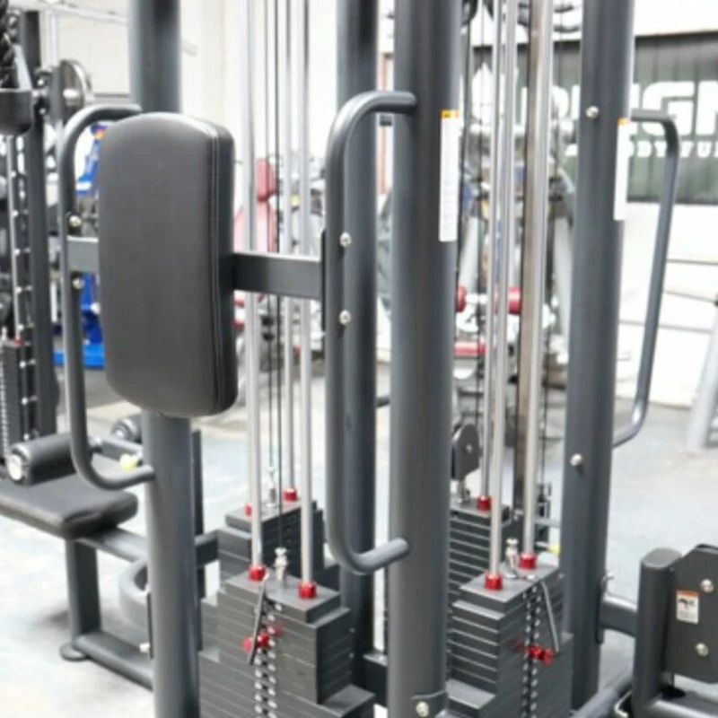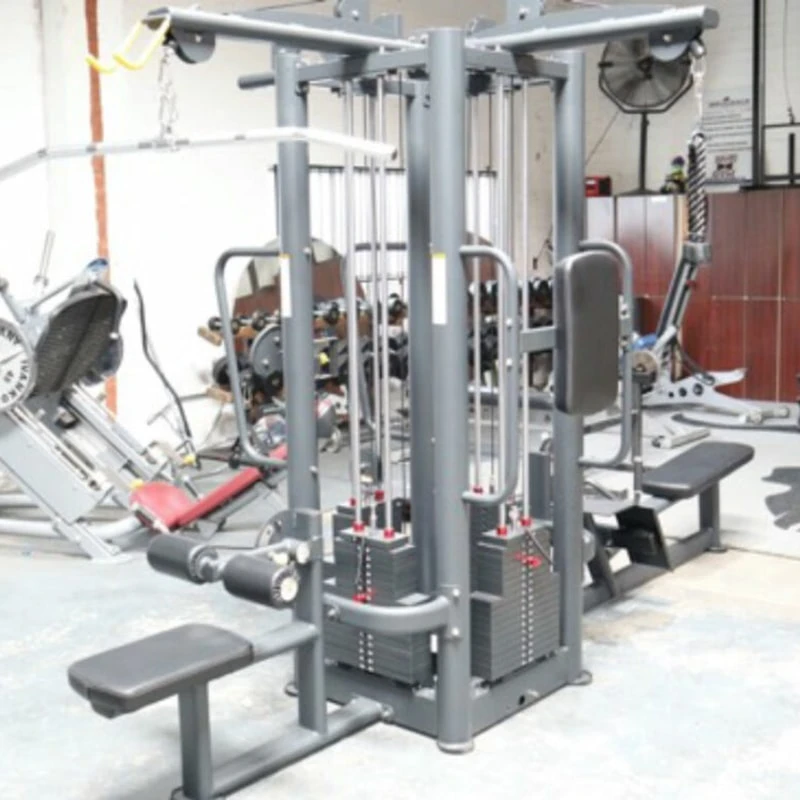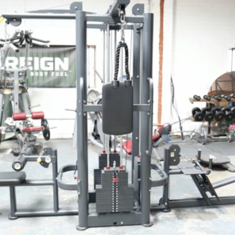 The BodyKore 4 station jungle gym is multi-dimensional strength training. The stations include a lat pull down, seated row, adjustable cable arm and tricep station. Each station is equipped with 220lb weight stack and the cable attachment used in the station.