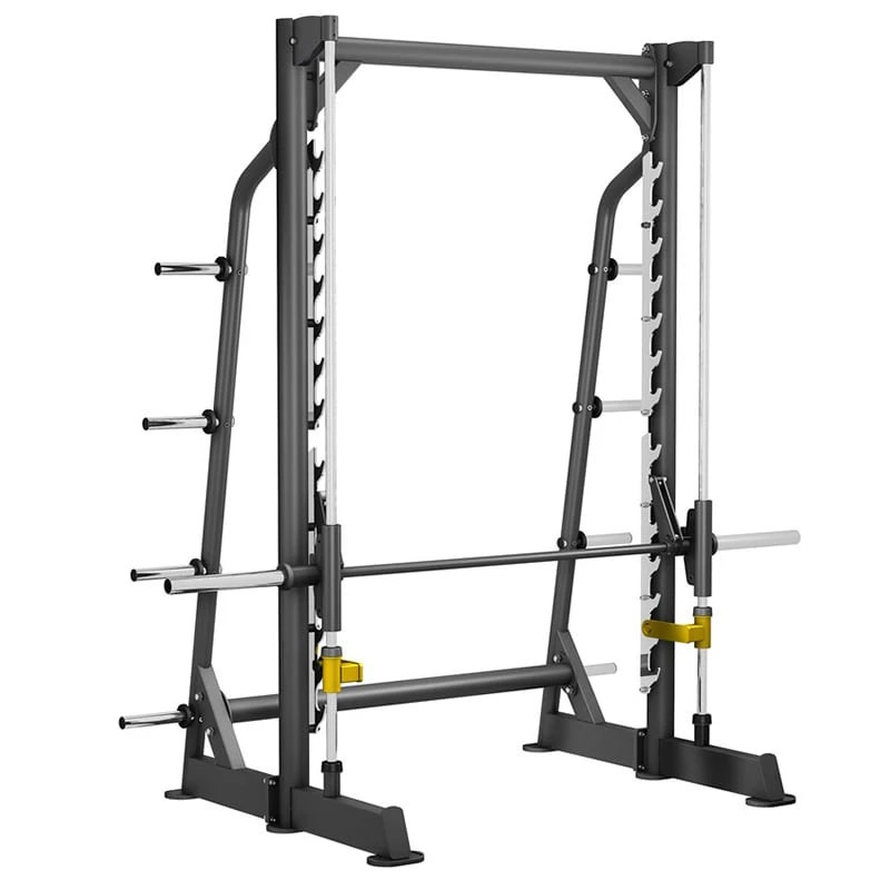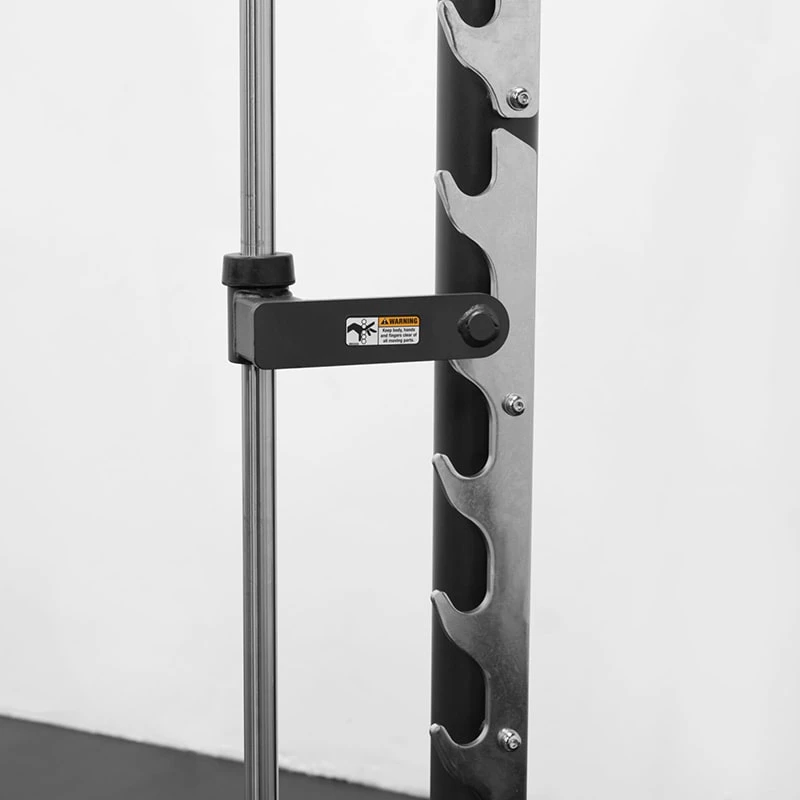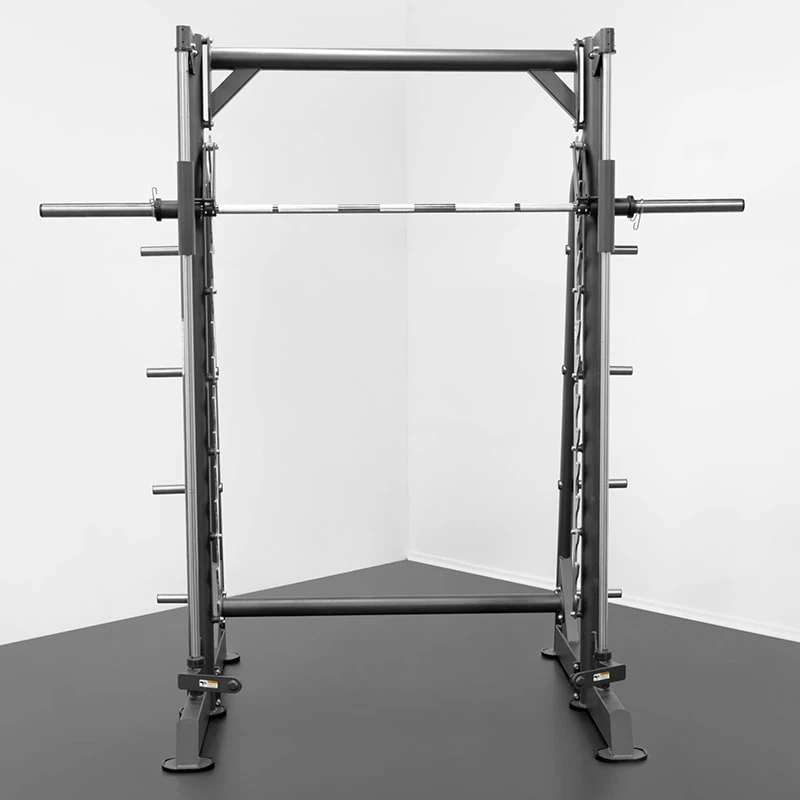 The BodyKore Signature Series G271 Smith Machine is made with a counter-balanced double pulley system to ensure safety. The high-quality guide rails provide an even, smooth movement and the multiple safety spotter positions allow the user to utilize the machine for many different exercises.