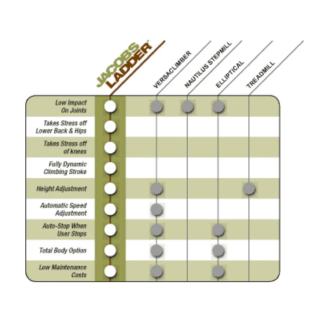 Jacobs Ladder provides the most efficient exercise for those serious about conditioning. Unlike most cardio machines, this patented treadmill climber utilizes low impact, high range of motion exercise to provide a superior cardio workout to both the upper and lower body.