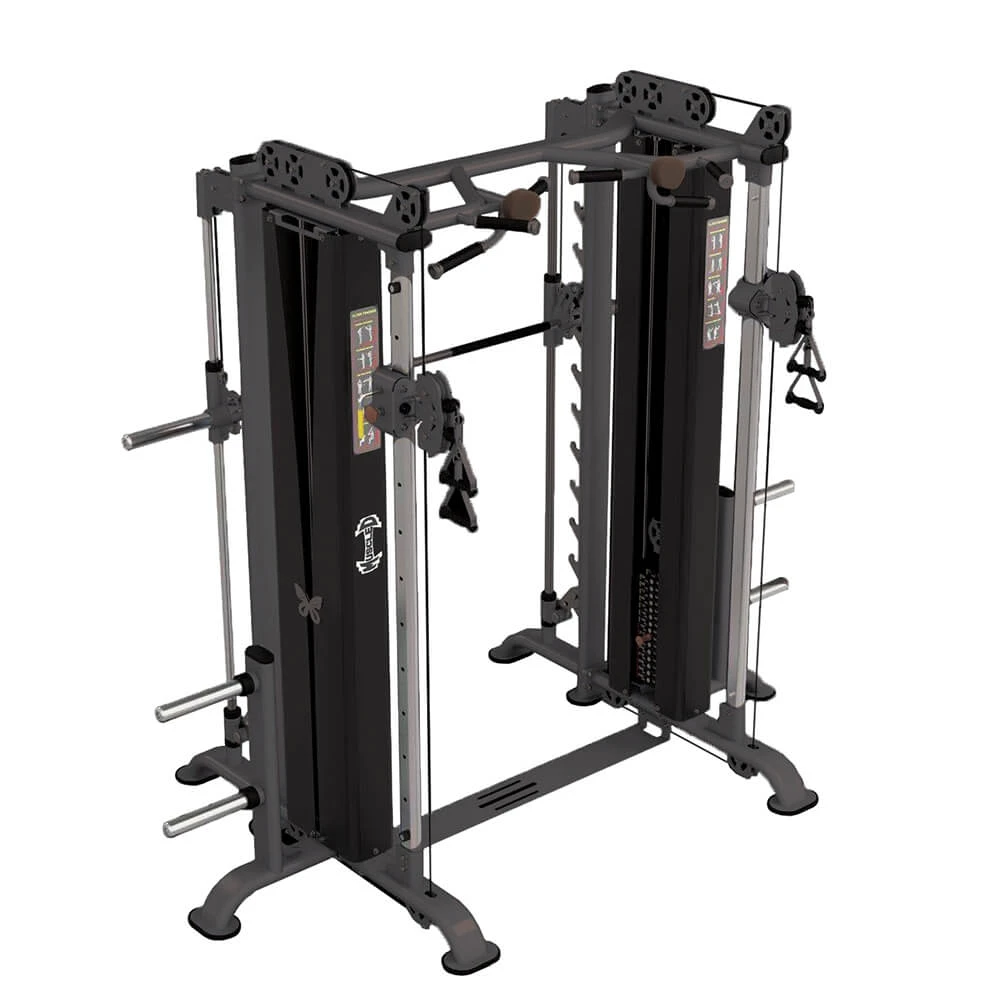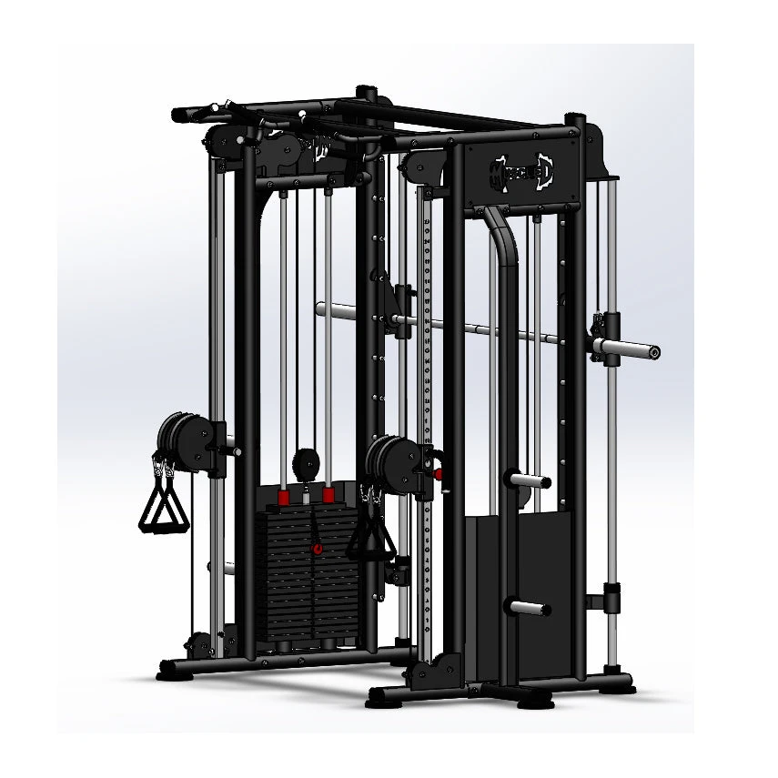 This machine combines the functionality of a Smith machine with a Dual Adjustable Pulley system, providing a wide range of exercises for comprehensive strength training.