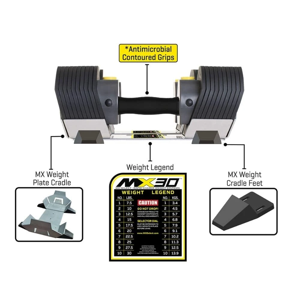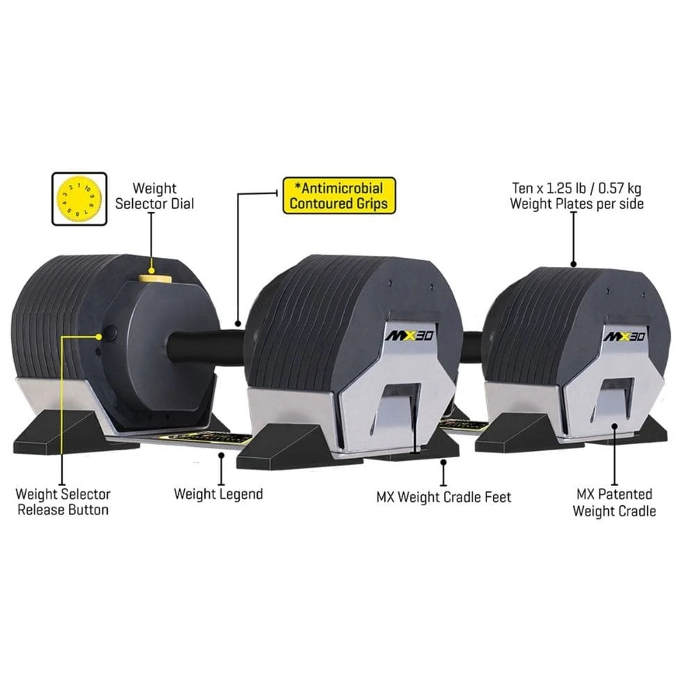 The MX30 Rapid Change Dumbbell System features our unique MX Select patented rack & pinion selection system: compact size, balanced feel and totally secure.