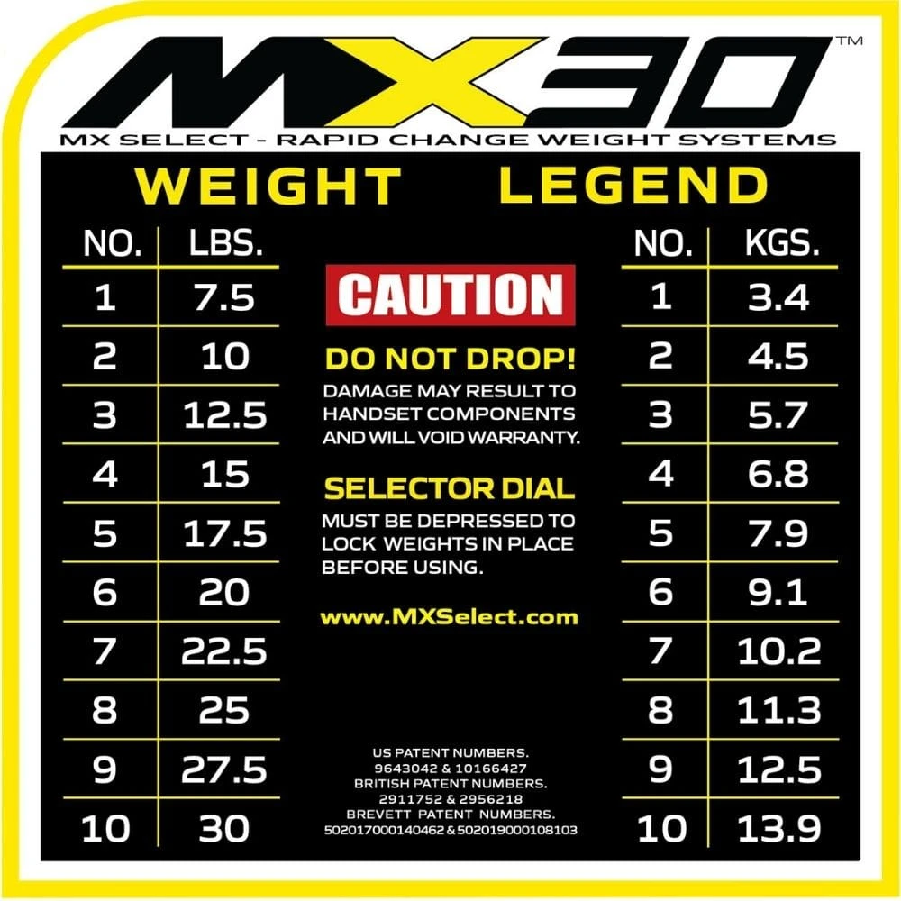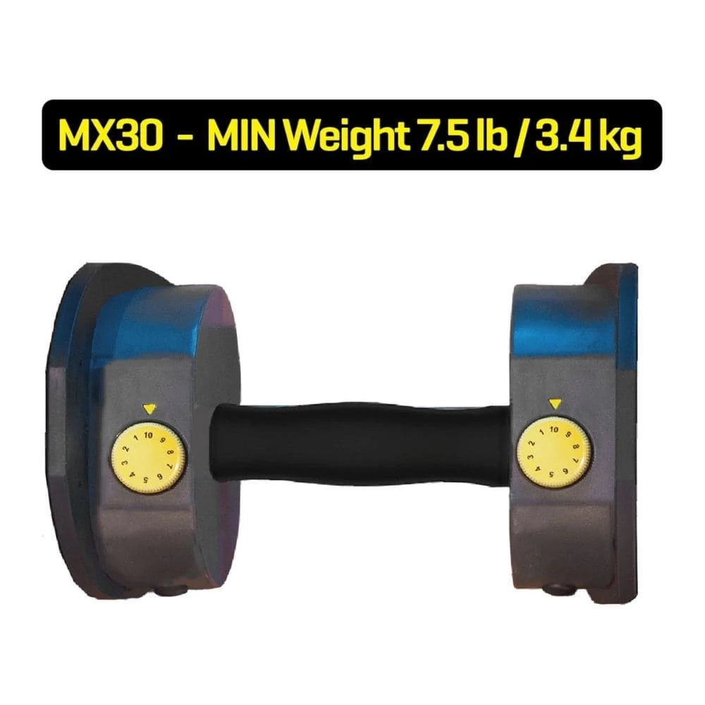 With the MX30 Dumbbell cradled you select the weight from 7.5-30 lbs (3.4-13.9 kg) at the turn of a dial. The selected weight level is locked into place as soon as the selector dial is pushed home.