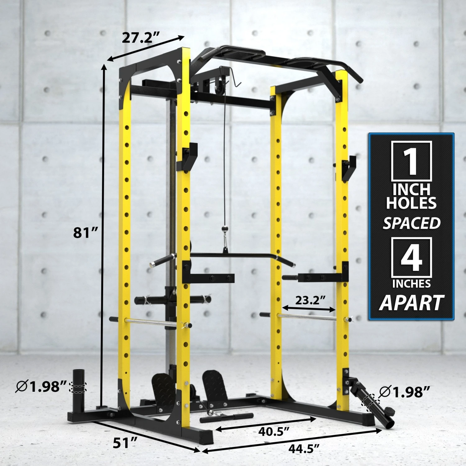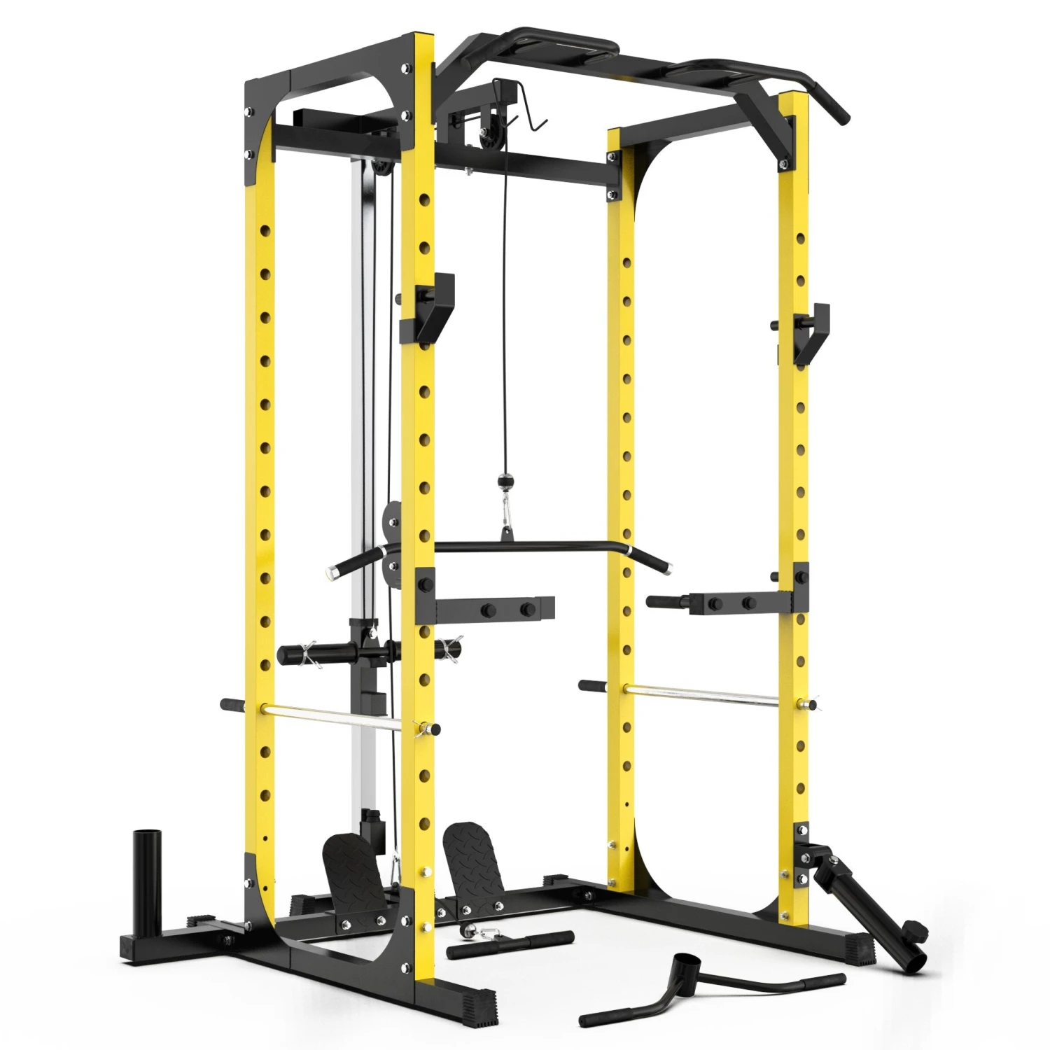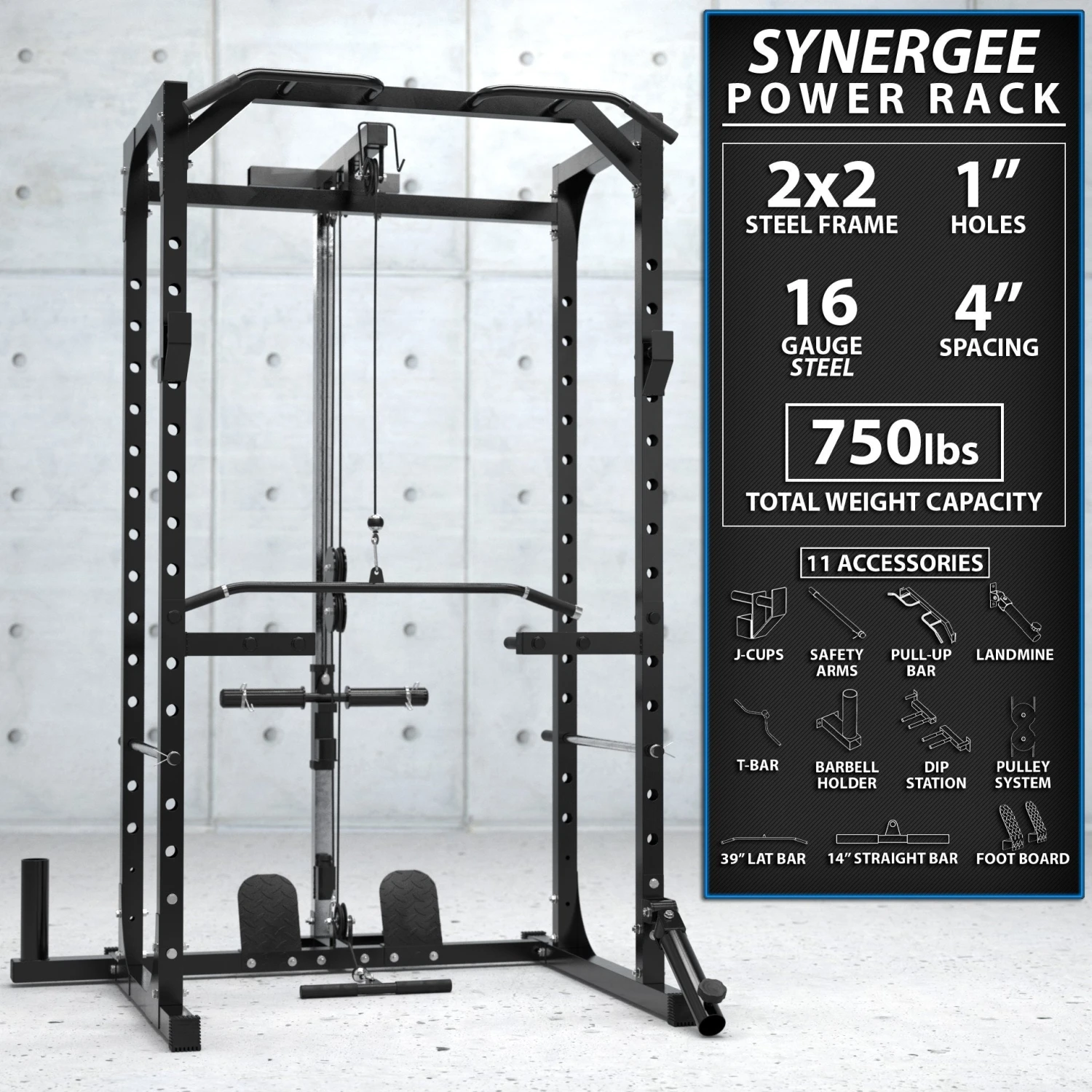 The Synergee Power Rack includes J Cups, Safety Arms, a Pull Up Bar, Landmine & T Bar Attachment, a Barbell Holder, Dip Station Attachment, a Pulley Station with a 39” Lat Bar and 14” Straight Bar and Foot Board. PHEW that’s a lot! This freestanding power rack provides a full-body strength and body weight workout station!