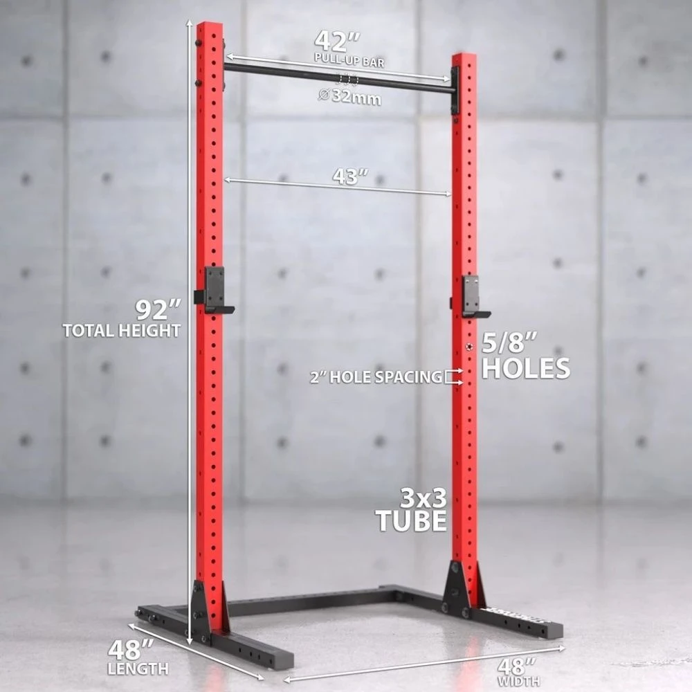 The Synergee Squat Rack stands 92″ tall and has a 48″ x 48″ base. The entire frame is welded with gussets to add extra-reinforced stability; and all open frame ends are capped to make it extra safe. Bolting to the floor is not necessary but encouraged for any athletes planning to do kipping pull ups and muscle ups regularly. Floor mounting brackets are available for purchase separately.