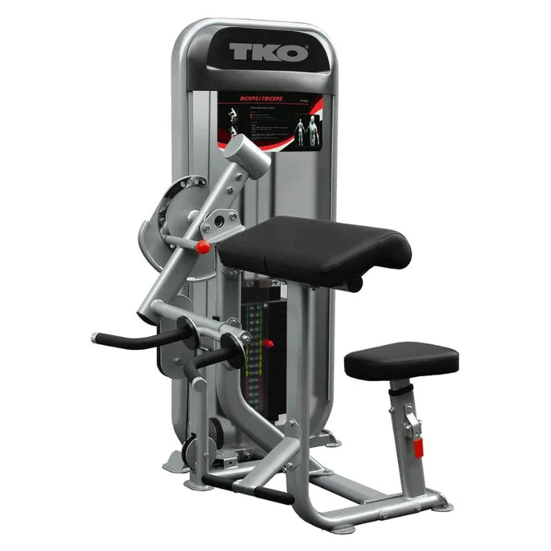 The TKO Achieve Dual Bicep Curl / Tricep Extension provides a combination of exercises in a compact space that includes:Â bicep curls and tricep extensions. Â A multi-position seat pad and multi-grips allow this machine to accommodate a wide range of users. Â