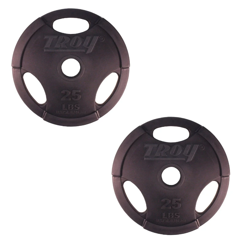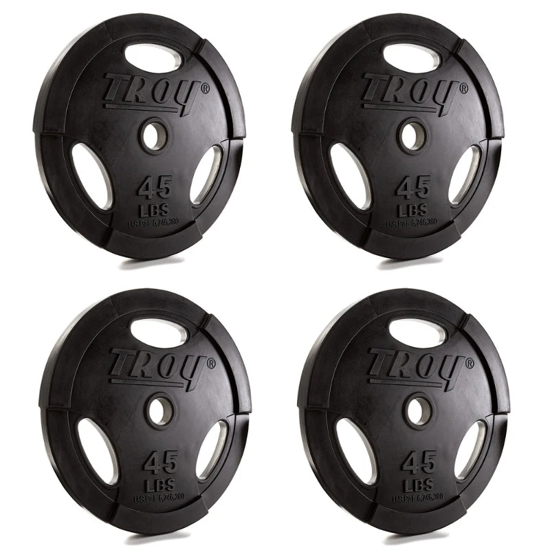 The TROY GO-U “Quiet Iron® EZ-lift” interlocking urethane coated Olympic weight plates are rated for commercial use and are perfect for both home gyms and commercial gyms alike.