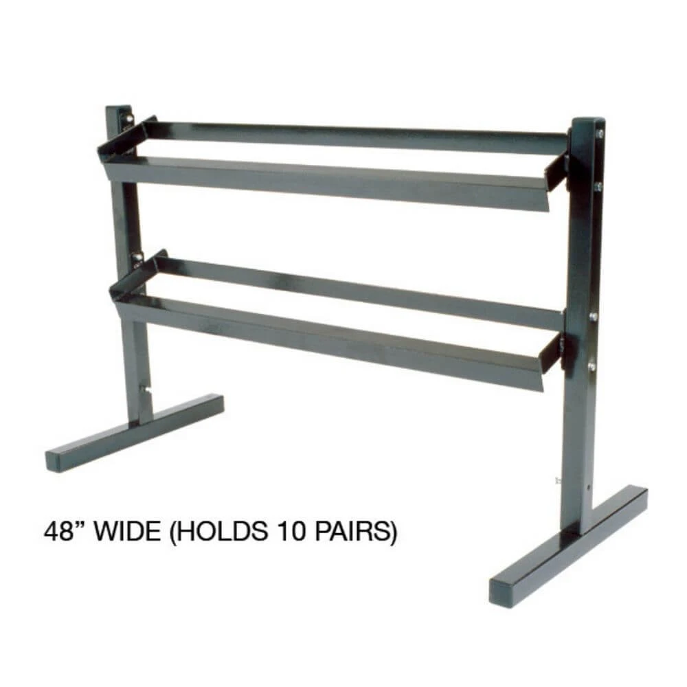 - This compact 48″ wide 2 tier economy dumbbell stand is sturdy, durable and attractive