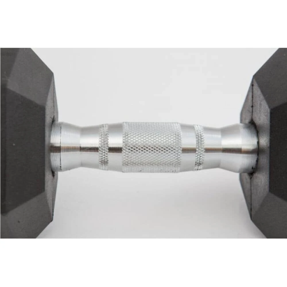 These safe, attractive dumbbells have contoured, knurled chrome handles and durable rubber-covered heads for increased safety and comfort. The heads are permanently affixed to a thick 35 mm solid steel shaft improving the strength of the head / handle joint.